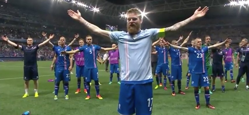 | Iceland Captain Aron Gunnarsson leads teammates and travelling fans in the celebratory viking chants |